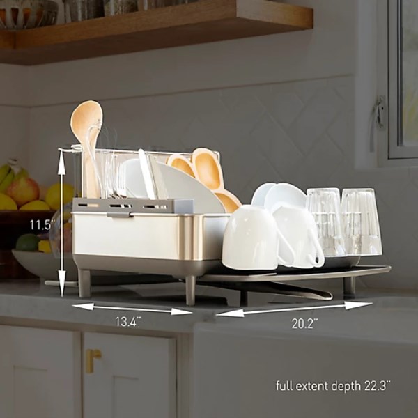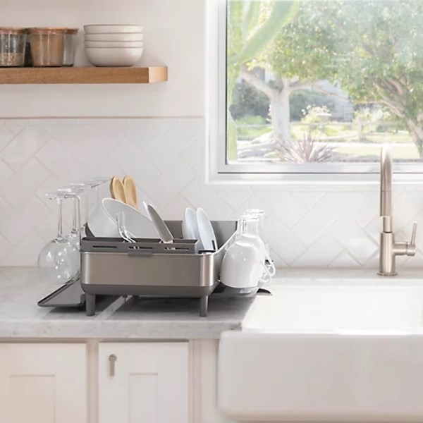 The simplehuman steel frame dishrack has a solid stainless steel frame that matches the aesthetic of modern upscale kitchen appliances. It has a swivel spout that pivots so you can drain water directly into the sink, and it also can be removed for easy cleaning. An anti-residue coating prevents residue buildup and water spots. Silicone-capped wire rack holds dishes tightly without scratching or chipping. The wine glass holder hangs up to 4 wine glasses — even those extra-large Bordeaux glasses. Anti-slip rubber feet keep the dishrack in place on the countertop. A fingerprint-proof coating helps protect against smudges.