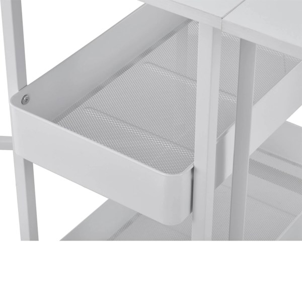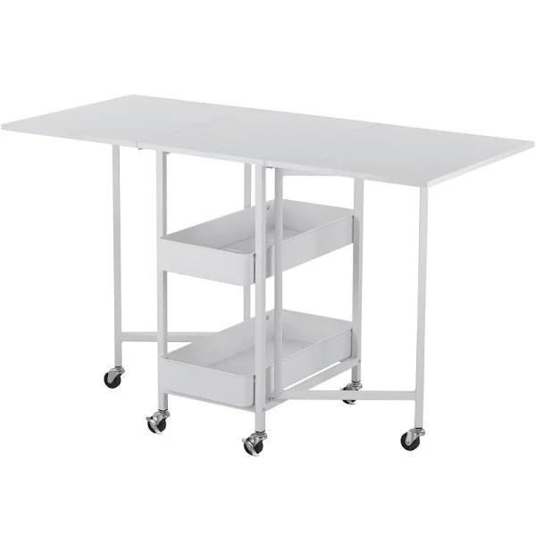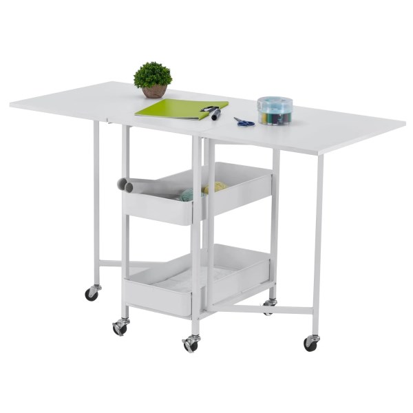 This table cart with trays is perfect to store your art and craft supplies. This table cart with trays is perfect to store your art and craft supplies. Its sturdy, flat surface is great to work on your DIY projects, while the wheels of the cart will let you move it around easily. To keep the cart in place, this rolling cart features 4 locking caster wheels. Once you are done working or crafting on the table, you can move the extended sides and fold the 2 panels to conserve storage space. To prevent the table from being top-heavy and tipping over, place heavier items in bottom trays. For assembly instructions click here. Details: 51.18″ x 23.62″ x 31.5″ (130cm x 60cm x 80cm) expanded dimensions 16.46″ (41.8 cm) wide when folded only 140 lb. (63.5 kg) maximum load limit per table 20 lb. (9 kg) maximum load limit per tray MDF, steel and plastic Contents: 2 metal mesh trays (23.23″ x 11.22″ x 3.35″ / 59cm x 28.4cm x 8.5cm each) 2 panels to expand work surface 6 wheels (4 locking)