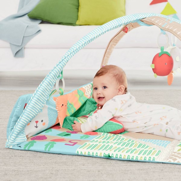 Playing with food is a good thing! A colorful garden of fun fruits, veggies and more, our Farmstand Grow & Play Activity Gym stimulates baby’s senses and continues to teach as they grow. Packed with lots of engaging textures and sounds for baby to explore, the soft playmat features cheerful farm graphics and numbers. Fold-up sides create an enclosed playspace that’s perfect for tummy time play. A bright watermelon wedge pillow with plush texture, and a cute side pocket let baby “pick” their own veggie. Five hanging toys include an avocado rattle, a beet squeaker and a musical bunny to keep baby busy and happy. When little ones sprout up, the removable arches convert to a growth chart.