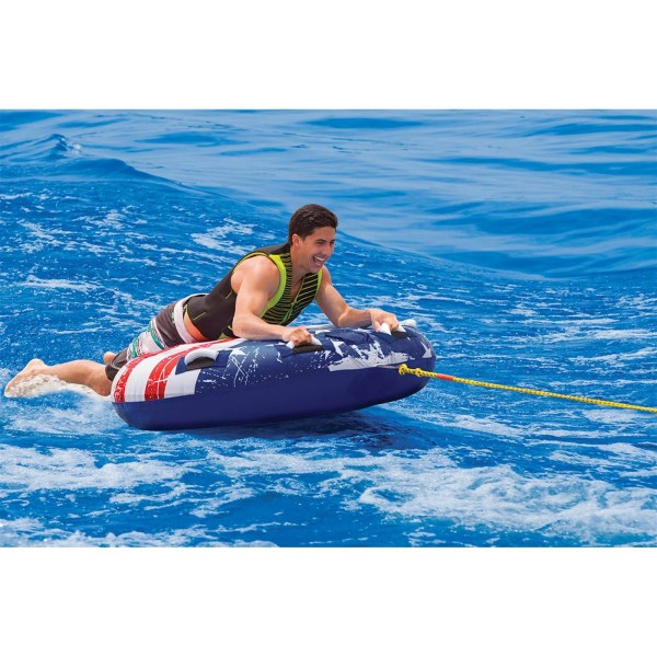 Get out on the water in style this summer with the SportsStuff Stars and Stripes 3 Towable Nylon Inflatable Rider Tube. You’ll be the talk of the lake on Independence Day with it’s patriotic stars and stripes design. With the double-stiched, full nylon cover, this 3-passenger tube is built to last when your friends join you out on the water. And, your hands will be protected with the double webbing foam handles with knuckle guards. Don’t fret about the time it takes to prep the tube, since it’s no hassle at all. The speed safety valve comes equipped for fast inflation and deflation. Riders will have no problem climbing onto the tube from the water with the thin profiles of the tube. With the Kwik Connect tow point on the front of the tube, you and your passengers can be hooked up and ready to go as soon as you leave the no-wake zone. This tube also comes with a heavy-duty K80 PVC bladder that is built to last. Make waves all summer long with the SportsStuff Stars and Stripes 3 Towable Nylon Inflatable Rider Tube.