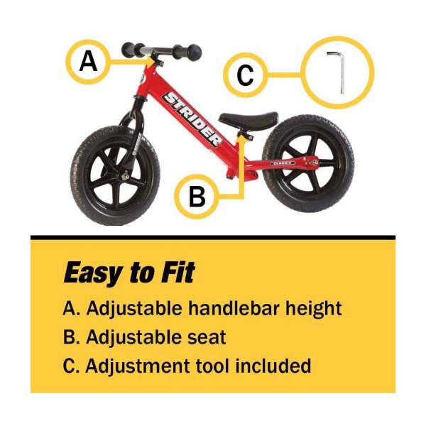 Our Skill-Building Entry-Level Model. STRIDER balance bikes are the industry-leader when it comes to helping children as young as 18 months learn to ride on two wheels. The lightweight pedal-less design allows children to straddle the bike with both feet on the ground and easily propel the bike by walking or running. This natural method puts the focus on the fundamentals of balancing leaning and steering without the distractions and complications of pedals or training wheels. Strider Bikes are scientifically proven to increase balance in children of all abilities in a fun and engaging way.