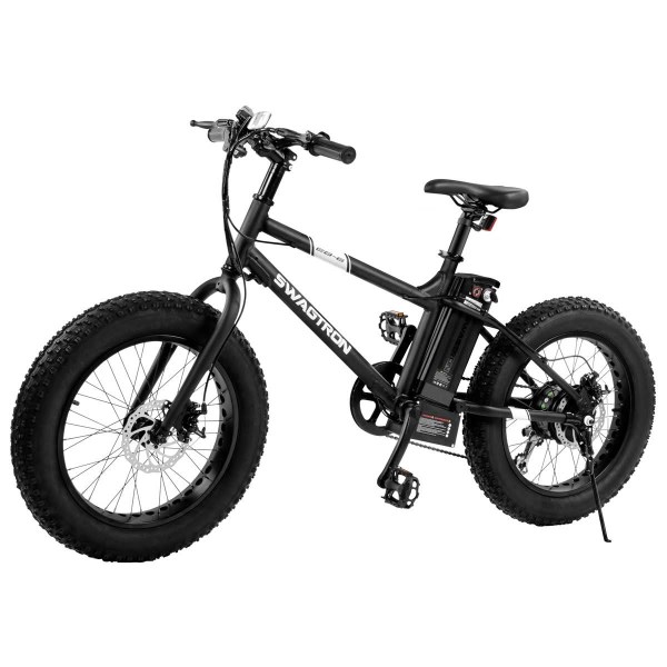 We all know that feeling. The one where your legs are burning and you can’t go on. It can be discouraging for kids new to mountain biking. But with the EB-6 kids’ electric fat bike, Swagtron gives you the power to go farther. The Swagtron EB-6 is a real fat bike engineered with youth in mind, built with a smaller frame and 20-inch wheels. It gives kids opportunity to experience the fun and adventure of mountain biking boosted by a 350-watt electric bike motor. The motor engages via a twist-grip throttle or through a “pedal to go” mode similar to pedelec. Adventure awaits with a range of up to 20 miles on a single charge at speeds of up to 18.6 miles per hour (throttle only, farther if you pedal). The EB-6 electric bike for kids features high-volume 4-inch tires to conquer a variety of loose surface conditions with confidence. In true fat bike fashion, it’s got traction to take on dirt, sand and snow. Front and rear disc brakes keep all that power in check, and easy-to-use handlebar-mounted brake levers put safety at your fingertips. Seven gears provide the right range for tackling a variety of terrain and a Shimano freehub means you can keep coasting even after you stop pedaling. Color: Black.