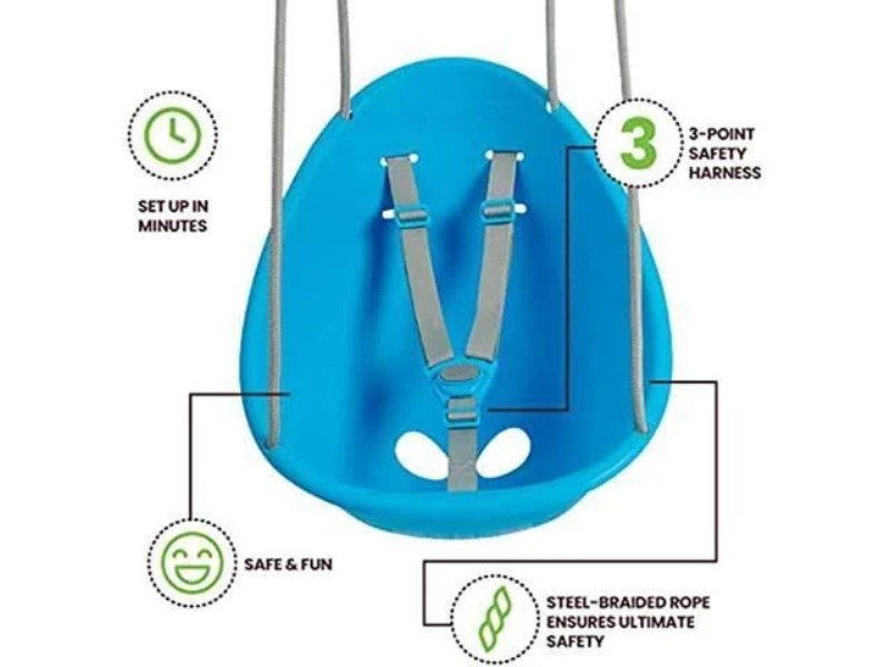 - Simple and Safe Set Up: Swing hanging hardware and everything you need to start swinging is included! Harness straps are adjustable to two different height settings to grow with your child.