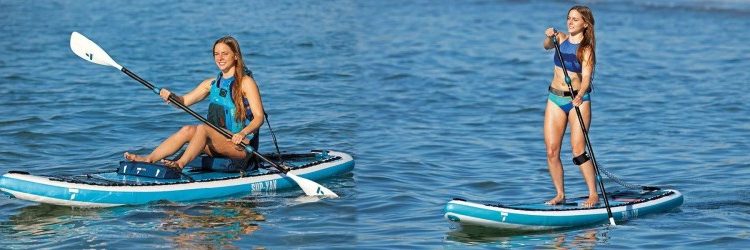 The Tahe 10’6 Air Beach SUP-Yak inflatable SUP is a versatile SUP that can also be used as a kayak. Thanks to the daisy chain attachment system, the conversion between kayak and paddle board is quick, easy and straightforward. The inflatable hybrid SUP yak is extremely stable and lightweight thanks to the High-Pressure Drop-Stitch construction, which makes transporting the board a real breeze. Special comfort foam pads along the entire length of the board allow you to take children and pets with you. Included in the complete package: Board, adjustable paddle, high pressure pump/knife, leash, fins, backpack and repair kit.