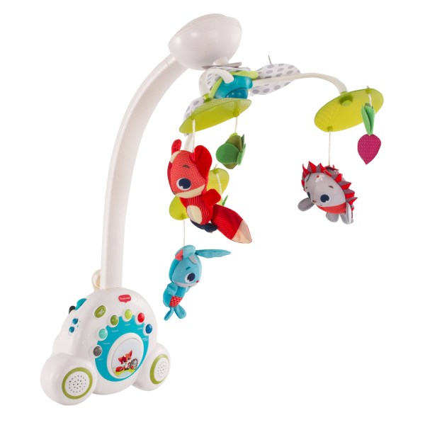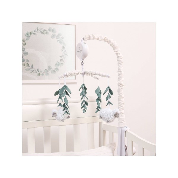 Counting sheep will lull your little one to sleep with a Farmhouse Sheep Ring Baby Crib Musical Mobile from The Peanutshell. Two stuffed sheep are suspended from central ring, accented with green felt leaves. Pairs wonderfully with the Farmhouse collection or perfectly suitable on its own. The mobile plays up to 12 songs with a digital music box; AA batteries required.