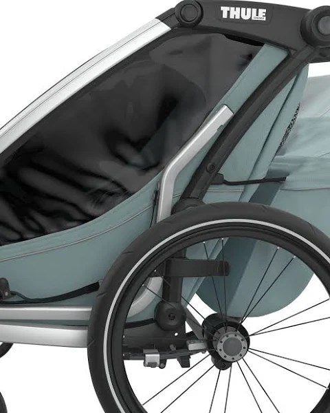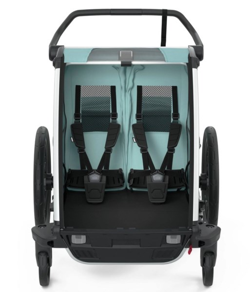The Cross 2 from Thule is ideal for all four activities – cycling, jogging, walking and cross-country skiing. The trailer is compactly foldable and can be easily stowed away. The seats can be converted into a reclining seat with a single movement. The Thule VersaWing system allows quick and easy changeover between different activities regardless of the set used. The adjustable leaf springs ensure a smooth ride. The comfortable upholstered seats are removable and easy to clean. The XL cargo space can be stowed away for more legroom when jogging. The Thule Click n’ Store offers a convenient way to carry your walking, jogging and cycling set on board when you want to switch between different activities. The bicycle and buggy set is included.