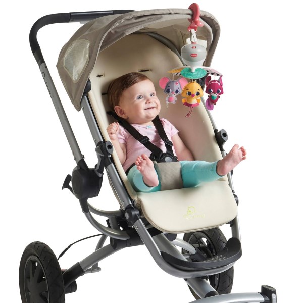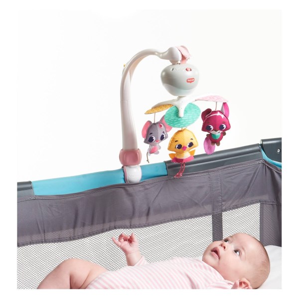 The Tiny Princess Tales Take-Along Mobile is designed to support your babys development at home or on the go. The engaging black and white contrasts and colorful hanging toys spin to provide visual stimulation for babies as their sight is still developing. Babies can practice their communication and language skills, while lying in their crib or sitting in their stroller, by cooing at the smiling characters. The cute Tiny Princess Tales toys stimulate baby’s senses and encourage the development of fine motor skills. The mobile’s clever design makes it easy to attach to most play yards, strollers, and bassinets, making it the perfect travel toy. The mobile features 30 minutes of 5 different melodies to help soothe and amuse your little one. Feeling secure is a crucial element in your baby’s development. Having soothing, familiar music available in unfamiliar, new places reassures your baby and supports emotional development. From a very young age, babies will enjoy a sense of security and joy while interacting with this whimsical mobile. Tiny Love strives to identify the latest discoveries in child development and translate them into engaging, interactive toys that nurture skills and delight the senses.