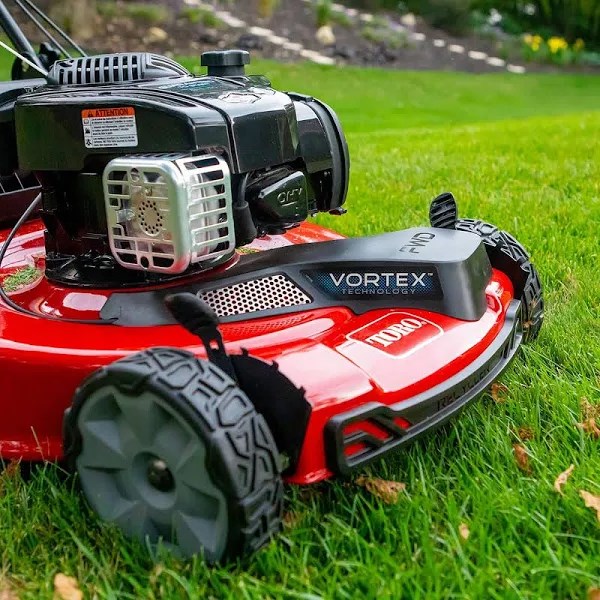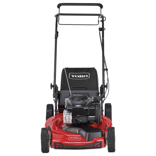 The Toro Recycler series is a patented cutting technology that brings an innovative mulching technique combined with our vortex technology to supercharge your mowing with an amped airflow that requires less energy to cut more grass into teeny-tiny, clump less clippings. Giving you Lawn Vitamins for free. Or throw on the grass bag and start your lawn vacuum that holds more so you empty the bag fewer times. Plus the Easy Go with the curved ergonomic handle allows your hands and wrists to rest comfortably as you mow. This model features a powerful 150cc Briggs and Stratton engine with a durable 22 inch steel deck frame for you to enjoy for years to come. The large rear traction high-wheels deliver easier maneuverability and greater cutting precision especially on uneven terrain. Combined with this mower being Hassle-free maintenance with no oil change ever, just Top It Off.