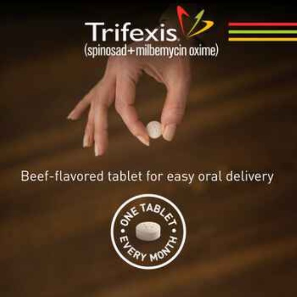 Trifexis is available in five sizes for oral administration to dogs and puppies, according to their weight. Each chewable, flavored tablet is formulated to provide a minimum dose of 13.5 mg/lb (30 mg/kg) and a minimum milbemycin oxime dose of 0.2 mg/lb (0.5 mg/kg). Spinosad is a member of the spinosyns class of insecticides, which are non-antibacterial tetracyclic macrolides.