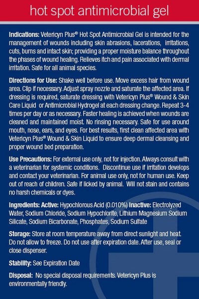 Constant biting, licking and itching can lead to painful hot spots and irritation. Vetericyn Plus Antimicrobial Pet Hot Spot Spray is specifically formulated to help soothe, protect, clean and heal skin affected by hot spots. By relieving discomfort, your canine companion won’t feel the need to continue licking, scratching and biting, which means he has a better chance of recovering faster and a lesser chance of getting an infection! Key Benefits Helps provide your pup with relief from irritated skin caused by constant scratching, chewing, licking and biting. Designed to help clean, soothe and protect hot spots. 100% non-toxic, so you don’t have to worry if your pet licks or ingests the formula once applied. Recommended by veterinarians for all pet parents with dogs who suffer from hot spots. Helps provide your paw-tner with relief without the use of antibiotics or steroids.
