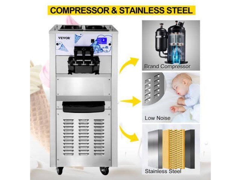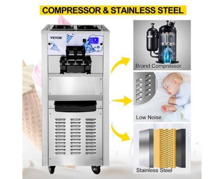 12L High Production Capacity: This commercial ice cream machine is designed with double 3.2 Gal (12L) hoppers, both made of food-grade 304 stainless steel, and can produce up to 10.6 Gal gallons (40 liters) of ice cream per hour, which can meet daily household or commercial needs. 2 Hoppers & 2+1 Flavors: Our soft serve ice cream machine integrates 3 flavors to meet various tastes, including 2 single flavors and 1 mixed flavor. During the mixing process, you can add your favorite foods, such as vanilla, strawberry, chocolate, mango, etc. 2500W Powerful Compressor: Driven by a 2500 watt brand compressor, this commercial ice cream maker has faster cooling, less noise, and lower power consumption. R404a & R134a refrigerant makes ice cream production more efficient and energy-saving, allowing you to don’t worry about soaring electricity bills while making the soft ice cream. Intelligent Panel Control: You can set the time, temperature, and hardness with the convenient control panel. The quantity will also be displayed on the screen for direct observation, and with just one click, the ice cream machine can quickly start self-cleaning. It is widely applied in restaurants, cafés, snack shops, fast food shops, supermarkets, pubs, and other places with great needs.