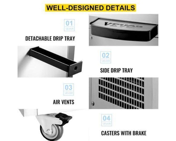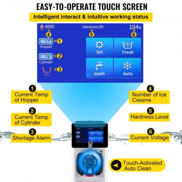 10-20 L/H Ice Cream Yield: Our commercial soft serve ice cream machine produces soft and fluffy ice cream efficiently. The 4.5 L (1.2 Gal) mixing hopper and 1.6 L (0.4 Gal) freezing cylinder (both are made of 304 stainless steel) can provide up to 200 servings in an hour, easily keeping up with your daily household or commercial. Smart Touch Panel Control: Our soft serve ice cream maker features an extra-large touch screen. The screen shows the current temp of the hopper & cylinder, allowing you to make prompt adjustments when needed. Quantity, hardness level, and voltage are also directly displayed. The shortage alarm function will remind you to add more ingredients to the mixing hopper. Plus, self-cleaning can be activated just with one click. Comprehensive Performance: The 1000W power (total) provides continuous and lasting power for our soft ice cream machine. With the 430W compressor, high efficiency and low noise are ensured during operation. The puffing tube makes your ice cream look more attractive and taste delicious, and it can save raw materials as well. Besides, the hopper and cylinder are wrapped in an integral foaming layer for a reliable cold insulation effect, keeping your ingredients fresh for longer. Considerate Product Details: Our soft serve machine combines user-friendly designs to improve your user experience. The dust-proof lid effectively keeps your mixtures clean and sanitary. The stainless handle is ergonomically designed and makes pressing ice cream out effortless. The extensive cooling vents on the back facilitate rapid heat dissipation and prevent over-heating damage. The drip tray is detachable for regular cleaning, and 4 rubber feet enhance the machine’s stability. Well-Designed for Wide Uses: Designed in a compact size of 21.7″x8.3″x26.8″(550x210x680 mm), our commercial ice cream maker can perfectly fit on your countertop. The stainless steel construction and stylish color ensure enhanced durability and an eye-pleasing appearance. This unit is widely applicable for snack bars, cafés, bakeries, fast food chains, restaurants, buffets, etc.