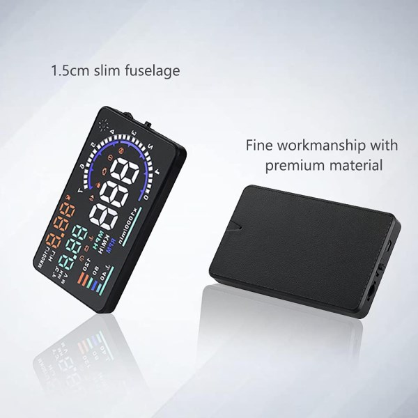 Features: –SAY GOODBYE TO ACCIDENTS: The head up display is designed to display the car dashboard information at driver’s front sight to avoid breaking traffic rules due to reading dashboard. The auto power on and off design means HUD works on while the car runs, and it will stop the service while your car powered off. –HIGH DEFINITION DISPLAY: You can choose manually adjust to your desired brightness, and it also will automatically reach the best state while you are driving. The use of nano-technology to eliminate unwanted reflections and can make display information more sharper. –RICH DISPLAY CONTENTS: It includes speed, engine speed, water temperature, battery voltage, instantaneous fuel consumption, average fuel consumption, mileage measurement. Plus, it will show fault code for you. It can be applied for cars in line with OBD II or EUOBD (on board automatic diagnostic system). –FRIENDLY REMINDER: It will flicker and alarm when the vehicle exceeds the speed limit set up in advance. The fatigue driving indicator light will flash to remind the driver to have a rest when it comes to a long drive. It also will remind you for high water temperature alarm, low voltage alarm, and shift reminding. Specifications: Product name: A8 HUD HUD color: Black Function: 13 Environment temperature – 40? ~+80? Barometric press:86-106KPa Relative humidity:10%-95% Environment voice:<=60dB Alarm of sound level:>=30dB(A) Work voltage:9V~16Vdc(12Vdc/400mA) Size of product:12.5 x 7.5 x 1.5cm/5” x 3” x 0.6” Package Weight: Approx. 280g Package Included: 1 x A8 Head Up Display 1 x Reflective Film 1 x OBD Cable 1 x Anti-skid Pad 1 x English User Manual