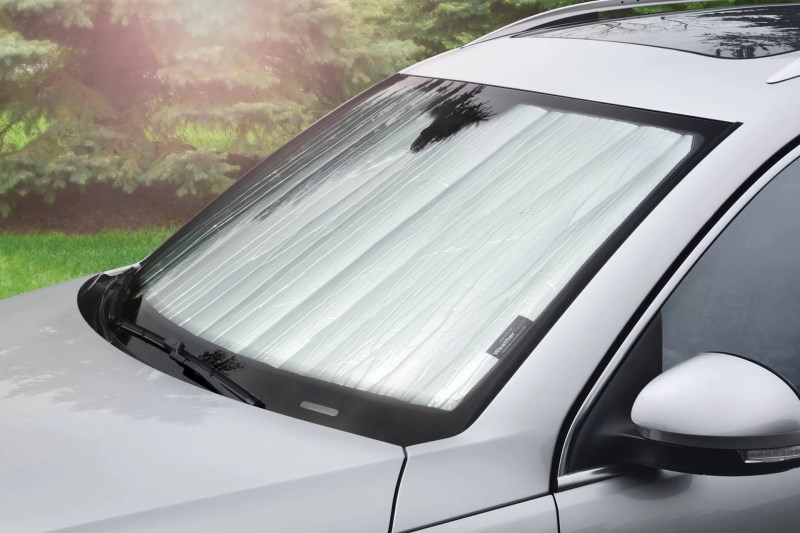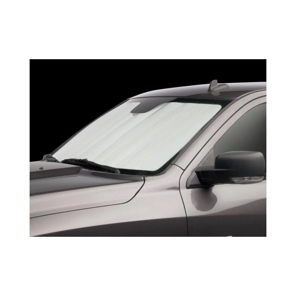 Custom-Fit TechShade Windshield Sun Shades are custom fit for each vehicle, and when properly installed, will remain snug in each window opening. For added security, fold down the visors to hold Techshade in place. Dual-Purpose Design Its dual-purpose design helps keep vehicles cool in the summer, and in the winter, also helps warm up interiors and avert frost build-up. Cools in Summer The Product Development team here at WeatherTech put the TechShade to the test and performed a series of “Hot and Cold Tests” simulating some of the hottest and coldest months of the year. In the summer months, when temperatures can soar into the triple digits, the TechShade significantly reduces the temperature of your vehicle’s dashboard and steering wheel. Heats in Winter In those freezing winter months, flip the TechShade around to its dark surface and it will help attract the sunlight, warm up your vehicle’s windshield/interior and avert frost build up. Sturdy Core Each TechShade features a foam core, which makes for easy handling and a sturdy fit in vehicle windows and windshields. Effortless Storage TechShade can easily be rolled up and stored with the help of its hook and loop strap system. Specially-designed storage bags are also available for purchase.