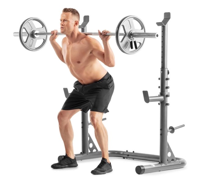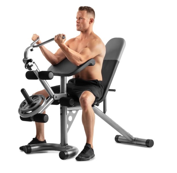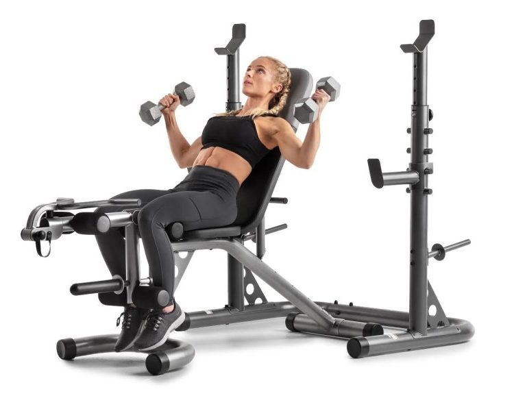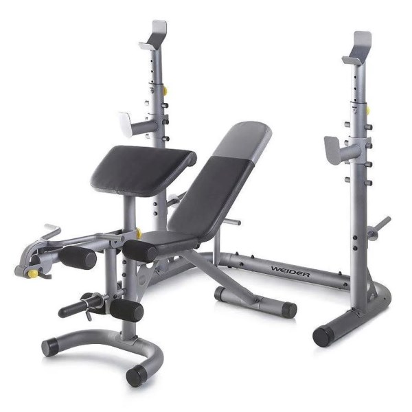 Offering multiple workout stations in a single, compact design, the Weider XRS 20 Olympic Bench and Rack combination provides the versatility you need to build the body you want. Whether you work out with a standard or an Olympic-sized barbell, the XRS 20s adjustable uprights will fit the job. And, with adjustable safety spotters that measure an impressive 9.5 long, youll get all the safety and support you need during your workout. The XRS 20 allows you to work out with the bench and uprights together or separately, turning the uprights into a premium squat center and the bench into a classic multi-position workout station for performing a variety of ab and weight workouts. This multi-station bench also comes with a sewn vinyl preacher pad, perfect for sculpting the biceps that youve always wanted, and a 6-roll leg developer to strengthen and tone your legs. Once finished, conveniently organize and store your weight plates with the XRS 20s built-in plate storage.