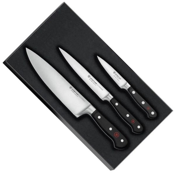 Wüsthof’s best-selling collection for generations, the Classic series offers a timeless design with superior performance and consistent quality. This premium line is an authentic piece for all food fans and sets the standards for quality and performance in the kitchen. With its vast selection of blade shapes and sizes, Classic offers the right tools for every professional chef and home cook. This set includes the best of the Classic series with three of the most important kitchen knives. Whether chopping, slicing, mincing, or carving; the 3.5” Paring Knife, 8” Cook’s Knife and 8” Carving Knife are made to handle any cutting task. Features a full tang that is triple riveted to the handle for added stability and precise control. Classic series handles are made of a highly durable synthetic material – Polyoxymethylene (POM) – which has a tighter molecular structure to resist fading and discoloration. Each Classic Knife is forged from a single block of High Carbon Stainless Steel and tempered to 58-degree HRC for lasting edge retention, integral blade strength, and ease of maintenance. The Precision Edge Technology (PEtec) yields a blade that is 20% sharper with twice the edge retention. Family owned for seven generations, Wüsthof was founded in Solingen, Germany over 200 years ago. Wüsthof’s cutlery carries the Solingen name, a designation reserved for products that meet the strictest quality standards.