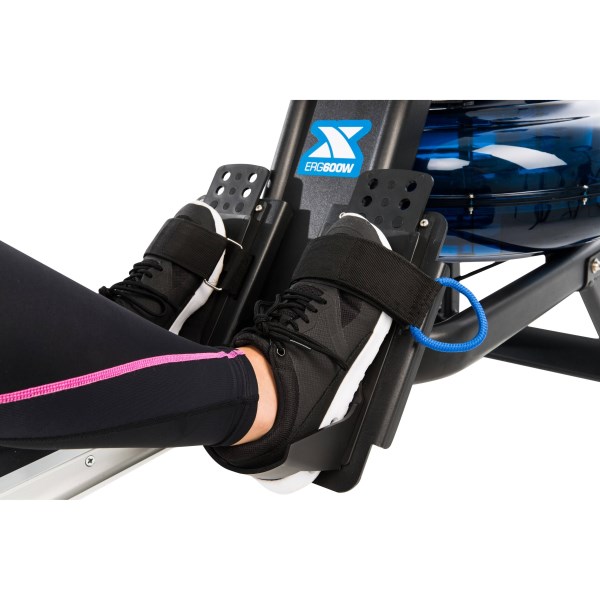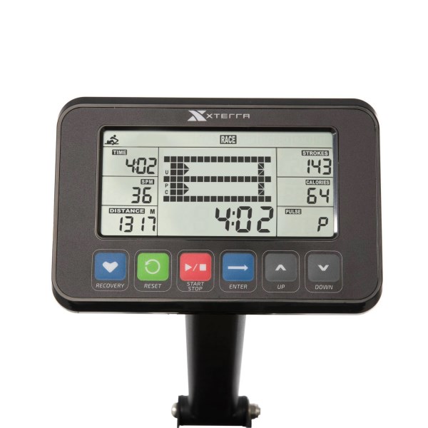 Bring the unparalleled full-body workout of on-the-water rowing home with the premium design and feel of the XTERRA Fitness ERG600W Water Rowing Machine. The full body rhythmic nature of rowing makes it wonderfully efficient at burning calories while also developing flexibility and strength. Plus, the “zen-like” water movement you hear from the ERG600W multi-bladed impeller can be soothing and meditative. The large and easy to read 5.5” LCD console with height and angle adjustment includes motivating programmable modes to keep you involved, inspired, and reaching your goals. Performance is top-of-the-class with a smooth action dual aluminum rail system, convenient stand up design for storage, industrial strength handle strap, flex pedals with easy numbered adjustments, and durable XTERRA multi-bladed impeller for a water rowing experience second to none. The XTERRA performance monitor clearly displays Total Time, 500M Time, Calories, Distance, Strokes, Strokes/Minute, Date, Room Temperature, and Clock. It also features motivating programmable modes for a wide variety of workouts. When you are not using your ERG600W Water Rowing Machine, simply stand it up and wheel it out of the way. With standing storage dimensions of just 33” long x 22” wide it won’t consume a room when not in use. Start making waves with your workouts today on the new XTERRA Fitness ERG600W Water Rowing Machine and exceed your expectations.