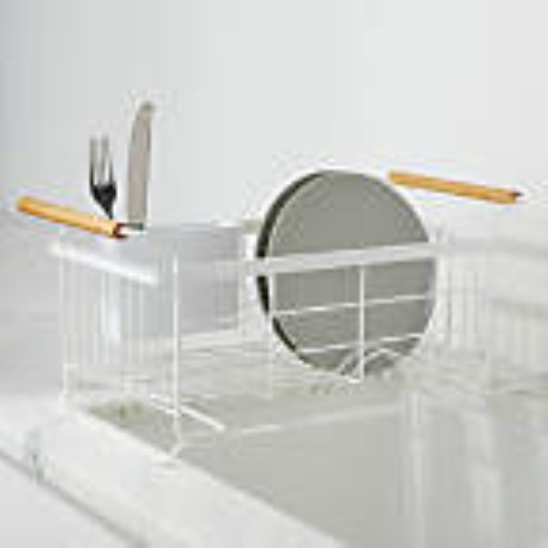 Dry dishes without using up precious counter space in this design-conscious dish drainer. The expandable rack stretches to fit over most sinks, so wet dishes can drip directly down the drain. With an open construction of steel finished in glossy white, the wire rack holds a variety of dishes while wooden handles provide warm contrast and a spot to hang a dish towel. A small removable utensil holder lets you tote flatware to your drawer. Inspired by Scandinavian design, this expandable over-the-sink dish drying rack is both lovely and practical. Yamazaki of Japan has been designing thoughtful and innovative home goods for over a century.