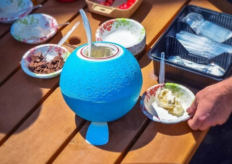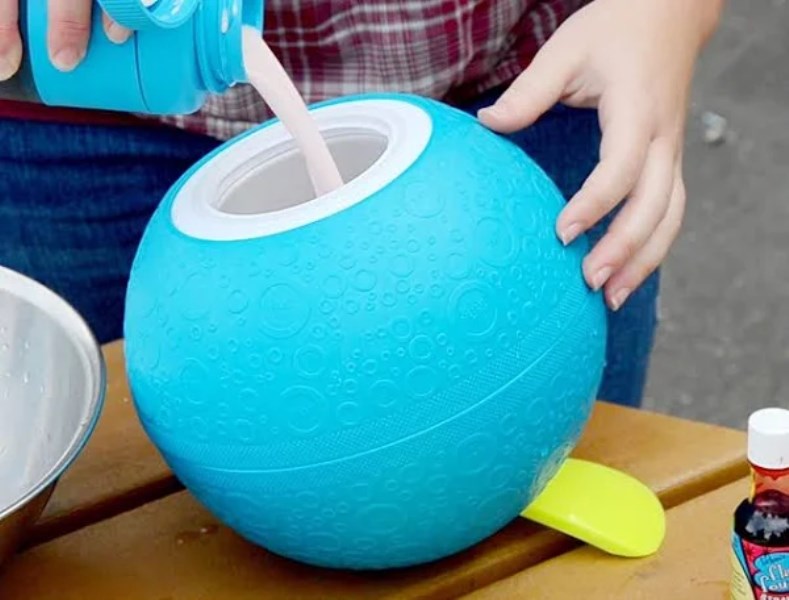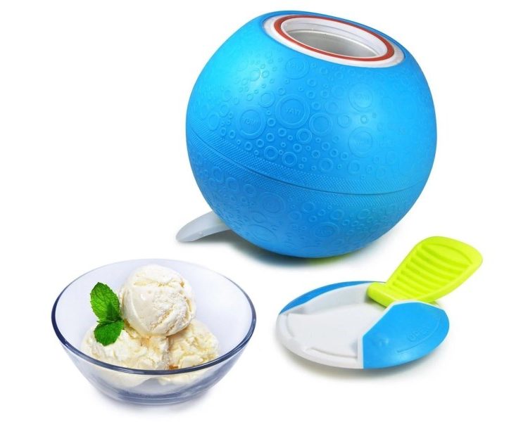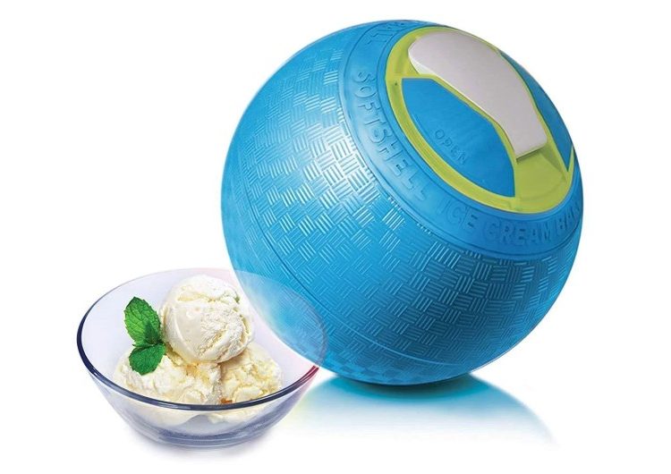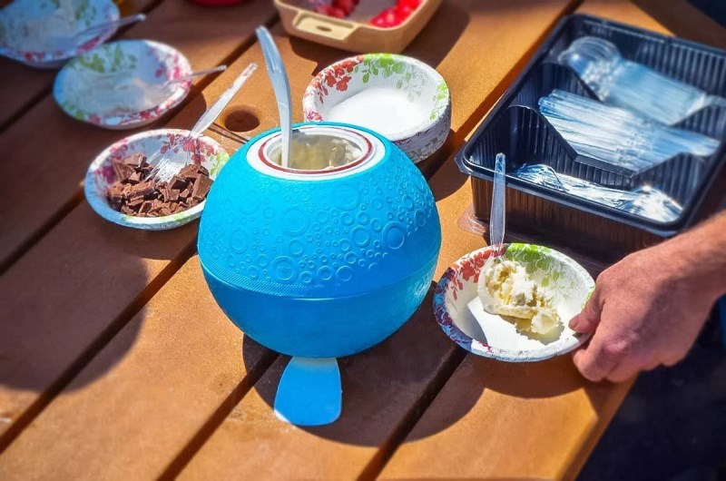 Make delicious ice cream anywhere, anytime great for parties, barbecues, picnics, camping trips, etc. Just add natural ingredients that are as simple as cream, sugar, and vanilla in one end then add ice and rock salt in the other end. The softshell exterior makes it fun to shake, roll, and play your way to a pint of delicious ice cream in about 20 minutes. Wide and shallow canister makes it easy to mix ingredients and scoop out ice cream. The built-in handles make opening the ends easy; flip back the handle and lay it on a table to allow easy access to stir ingredients or scoop out ice cream. Constructed from food-safe, BPA-free materials. Includes Pure & Simple recipe booklet.