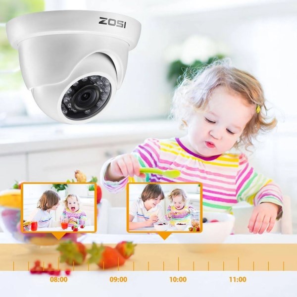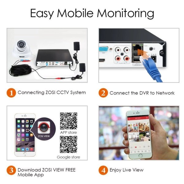 QR code scan via mobile device using our free ZOSI View app (available on iOS/Android). Live view and playback on your smartphone. *(2). 720P HD-TVI Video (Not 1080P) – Get a sharp and crisp image day or night with the Weatherproof camera s automatic IR-cut filter. Up to 65ft night vision. *(3). Ultra long continuous recording and easy USB backup:The 4 in 1 TVI DVR can be set to automatically overwrite the oldest stored footage,and you can backup the records via the USB backup *(4). Intelligent motion detection email alert with images; Motion detection recording allows you save more capacity hard drive(1TB hard drive Built- in,20g/day/CH for 720P) *(5). All systems CE and FCC certified with qualified power supplies.Guaranteed for 2 Year and Free life time Tech Support.